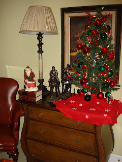 Well I have finally finished the other 2 trees I put around the house. The first one is of poinsettia's (love them), gift boxes and red and gold balls. This tree sits on my accent piece in the living room. I added a Santa Clause and another one of my pin cushions. I also placed a large Santa from The Home Depot next to the piece. Love the way all the Santa's look together. I still need to buy the tree skirt, but for now it is done.