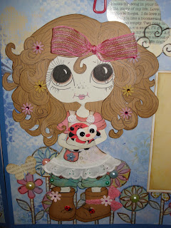 Don't you just love those big brown eyes. I used chalk. The lady bug she is holding I purchased at a chinese warehouse that sells party supplies. They had a bin with little things like this for cakes and cupcakes and everything was 10 for 1.00. The package brought 6 inside and I could not believe how perfect it was for this layout, the size of the eyes match hers.